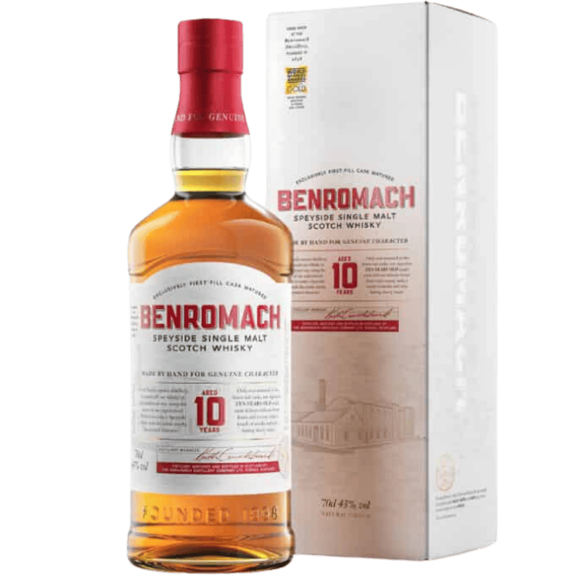 De Benromach 10 Years Old is een karaktervolle single malt uit Speyside, maar met een stijl die eerder herinnert aan de ‘old school’ Highland whisky’s van vroeger: licht geturfd, stevig van structuur en met veel diepgang. De whisky rijpt tien jaar op een combinatie van first-fill bourbonvaten (80%) en sherryvaten (20%), waarna een extra periode volgt op first fill oloroso sherry casks. Deze aanpak resulteert in een prachtige balans tussen rijp fruit moutige rijkdom, subtiele turfrook en een elegante kruidigheid. De spirit wordt langzaam gedistilleerd en met de hand vervaardigd in de kleine, traditionele stillhouse van Benromach in Forres waar alles draait om precisie en vakmanschap. Benromach 10 is toegankelijk, maar tegelijk diepgaand en authentiek en een whisky met persoonlijkheid, die zowel beginners als doorgewinterde liefhebbers aanspreekt. Ideaal als dagelijks dram.