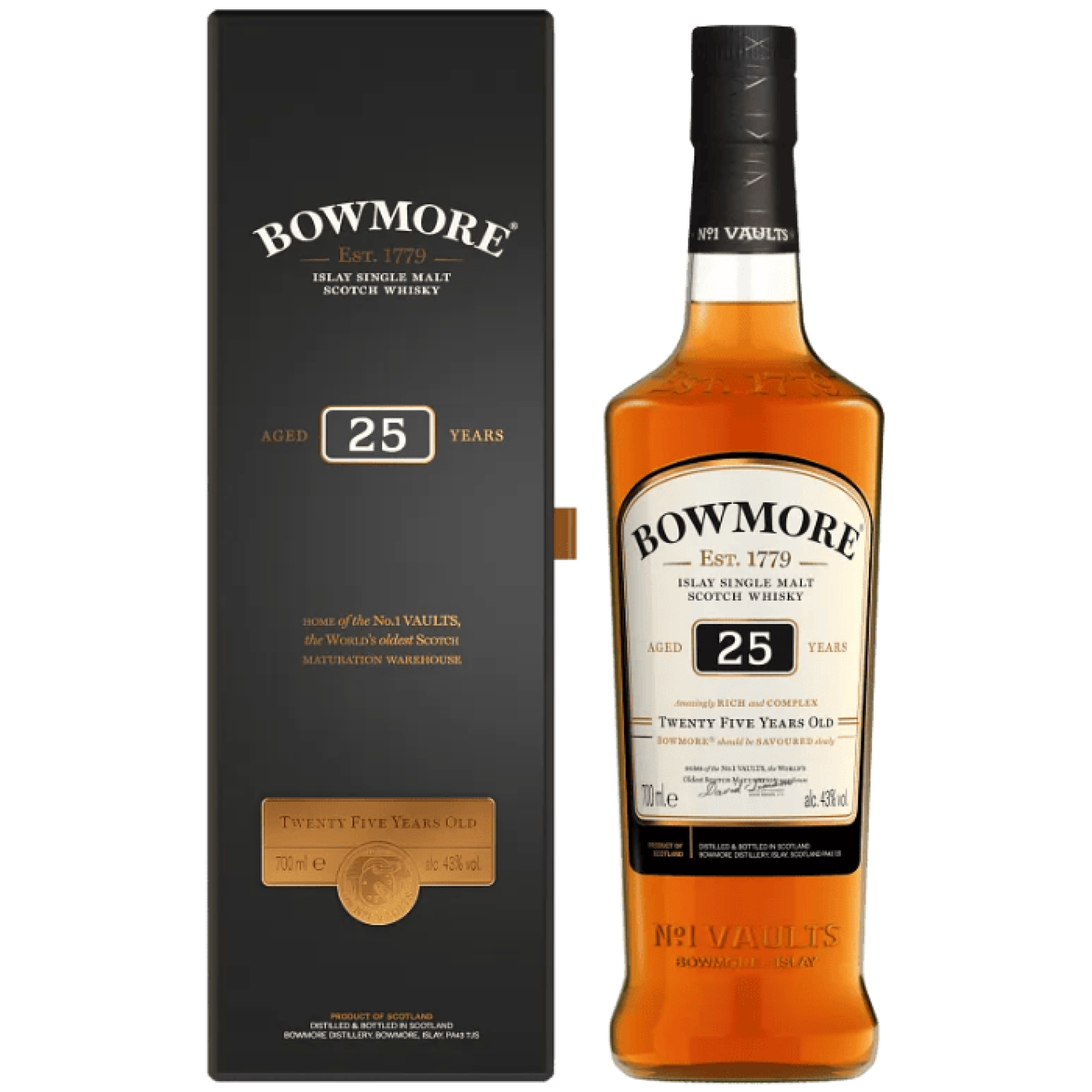 De Bowmore 25 Years Old is een van de kroonjuwelen van de gelijknamige Islay distilleerderij. Deze whisky rijpt gedurende een kwart eeuw in zorgvuldig geselecteerde ex Bourbon en vooral ex Oloroso sherryvaten, wat zorgt voor een rijke, gelaagde smaak. Wat deze expressie zo bijzonder maakt, is de combinatie van zachte turfrook, gerijpt fruit, donkere chocolade en een toets van zilt typisch voor Bowmore’s ligging aan de kustlijn van Loch Indaal. Na 25 jaar is de rook volledig geïntegreerd in het profiel, waardoor een elegante, bijna zijdeachtige whisky ontstaat. In geur en smaak biedt deze single malt tonen van vijg, rozijn, leer, sinaasappelschil en geroosterde noten, omlijst door warme rook en zachte kruiden. Een klassieke Islay met een diepe, ingetogen complexiteit – geliefd bij kenners wereldwijd.