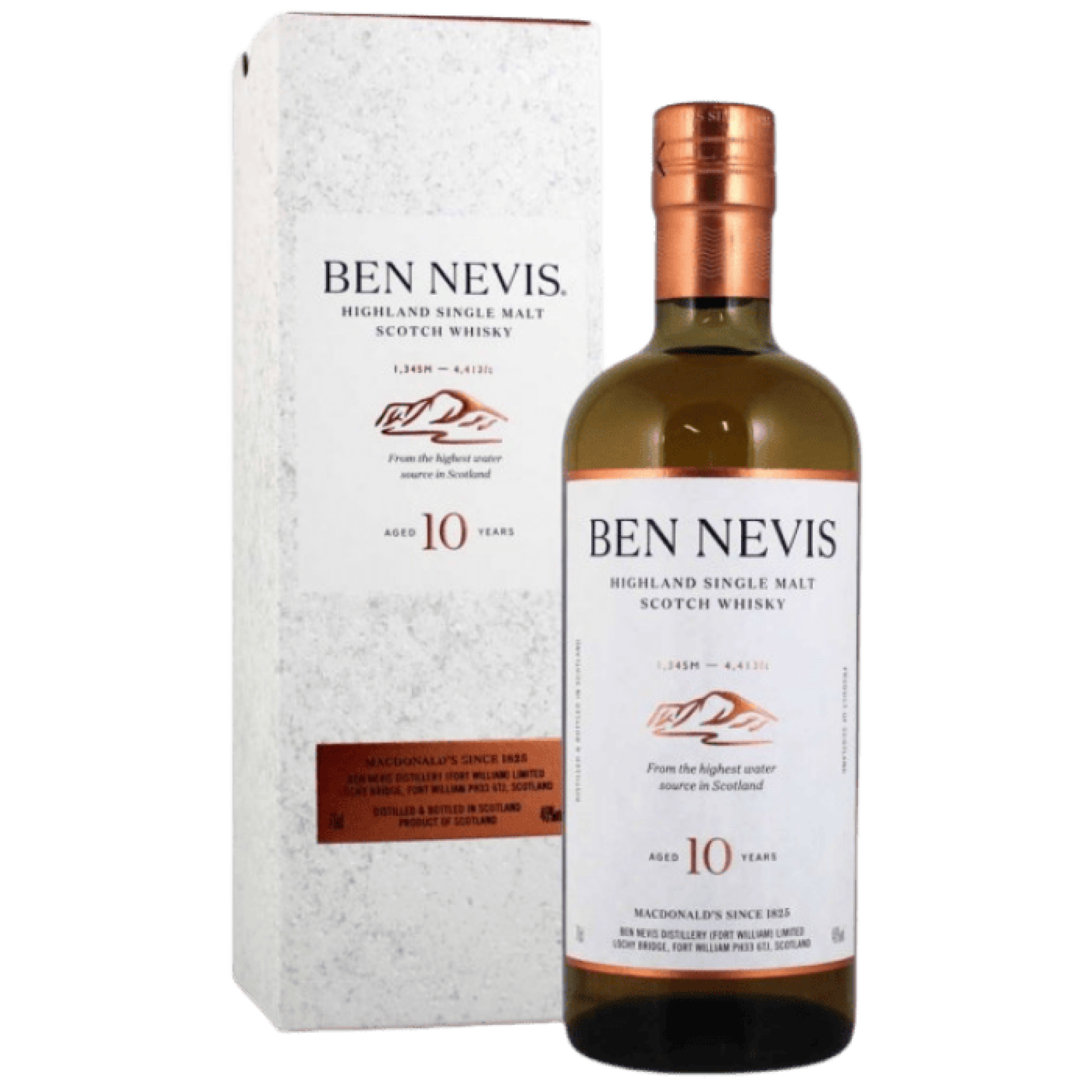 Ben Nevis 10 Years Old wordt geproduceerd in de gelijknamige distilleerderij aan de westkant van de Schotse Highlands waar de ketels worden gevoed door water uit de Allt a’Mhuilinn dat vanaf de berghellingen richting Fort William stroomt. De gerst wordt gemout door externe mouterijen en komt binnen met een laag fenolgehalte omdat de distilleerderij voor deze uitdrukking geen duidelijk turfprofiel nastreeft. De maisch vindt plaats in roestvrijstalen mash tuns waarbij helder wort wordt afgescheiden zodat de vergisting gecontroleerd verloopt.
