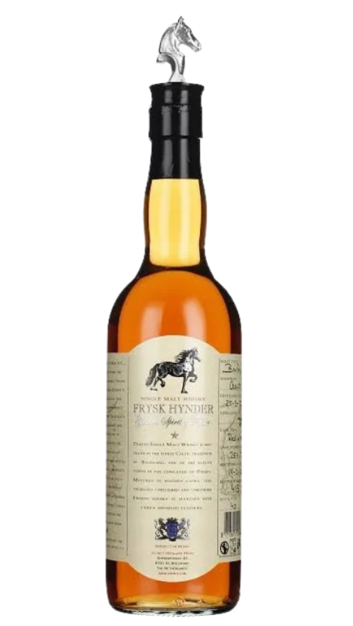 De Frysk Hynder Silver is een Whisky die ongeveer drie jaar oud is en afkomstig is uit Friesland. Dit is een heerlijke Nederlandse whisky die bewust buiten de traditionele categorieën valt is en een prachtig streekproduct! Waar de meeste whisky draait om lange houtrijping, ligt hier de nadruk juist op het pure distillaat.. Heerlijk fris, direct en ongepolijst. De term Silver verwijst naar het feit dat deze whisky niet (of slechts zeer kort) op hout heeft gerijpt. Daardoor heeft hij nog niet de kleur en rondeur van klassieke whisky, maar juist een helder en transparant karakter. Dit type whisky zit dichter op de kern van het productieproces: graan, fermentatie en distillatie. In die zin lijkt hij meer op wat internationaal soms “new make spirit” wordt genoemd, maar dan verfijnder en drinkbaar gemaakt als eindproduct.