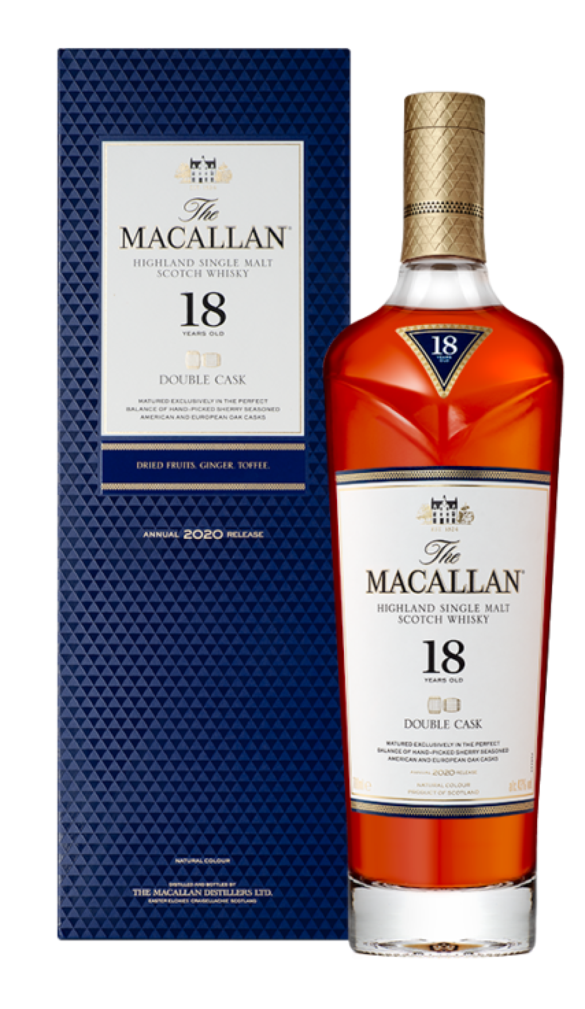 Geniet van de complexe en verfijnde smaken van de Macallan 18 Double Cask. Ontdek aroma's van gedroogd fruit, honing, karamel en een subtiele hint van chocolade, allemaal verweven met een fluweelzachte textuur en een lange, verwarmende afdronk.