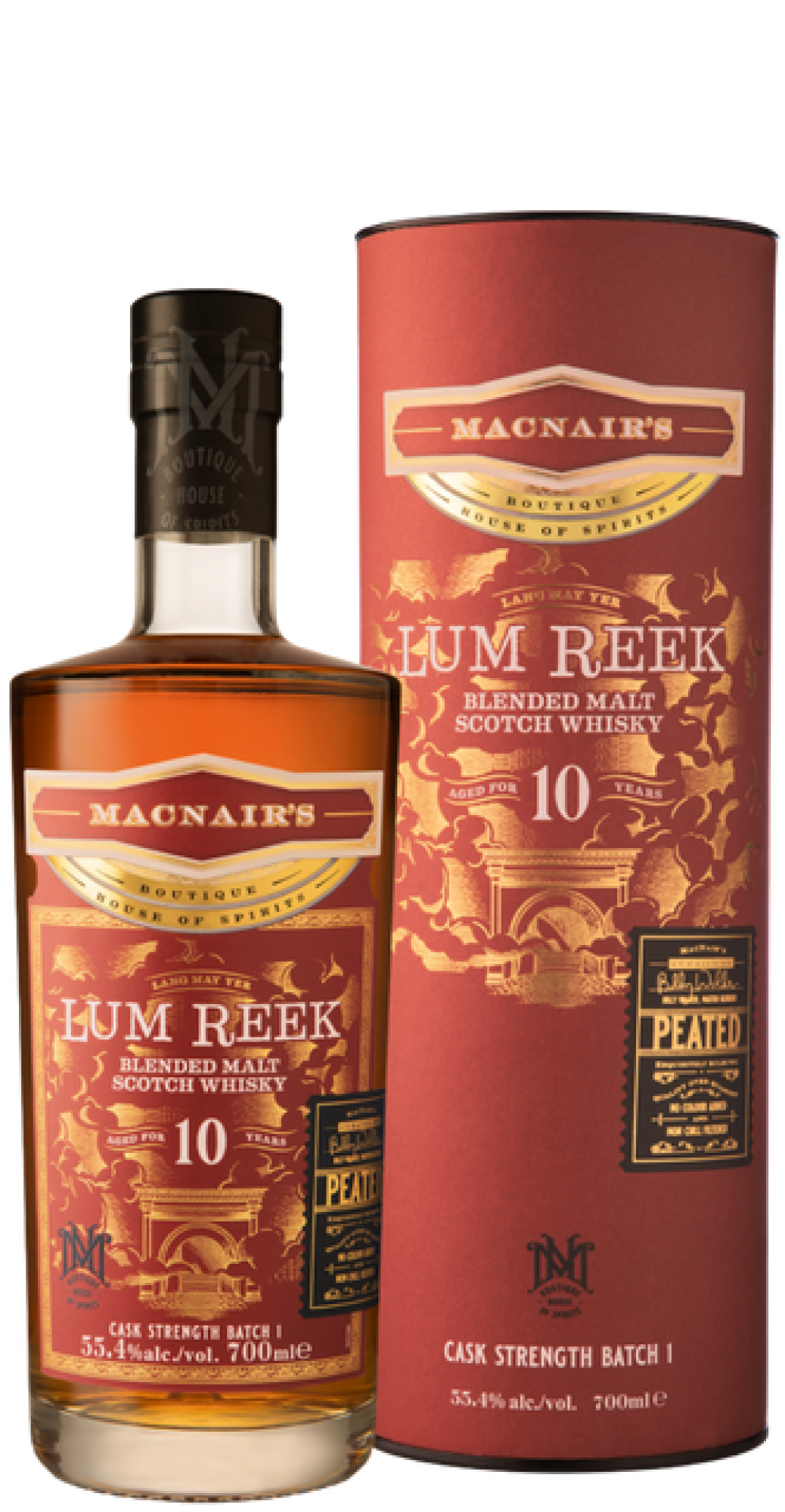 De MacNair’s Lum Reek 10 Year Old Batch 1 is een blended malt whisky met een uitgesproken rokerig karakter en grote aromatische complexiteit. De naam ‘Lum Reek’ verwijst naar de oude Schotse uitdrukking “Lang may yer lum reek” letterlijk: “Lang moge je schoorsteen roken”, oftewel: veel voorspoed. Deze whisky combineert geturfde malts uit Islay met fruitige componenten uit Speyside en Highlands, die vervolgens samen 10 jaar rijpen. Na assemblage wordt de whisky afgewerkt op een mix van oloroso sherryvaten, rode wijnvaten en virgin oak. Dit zorgt voor een gelaagd profiel waarin rook perfect in balans is met tonen van gedroogd fruit, chocolade, kruiden en hout. Gebotteld op 46%, zonder koude filtering of kleurstoffen, is dit een whisky voor liefhebbers van serieuze peat die verfijning zoeken in complexiteit en vakmanschap.