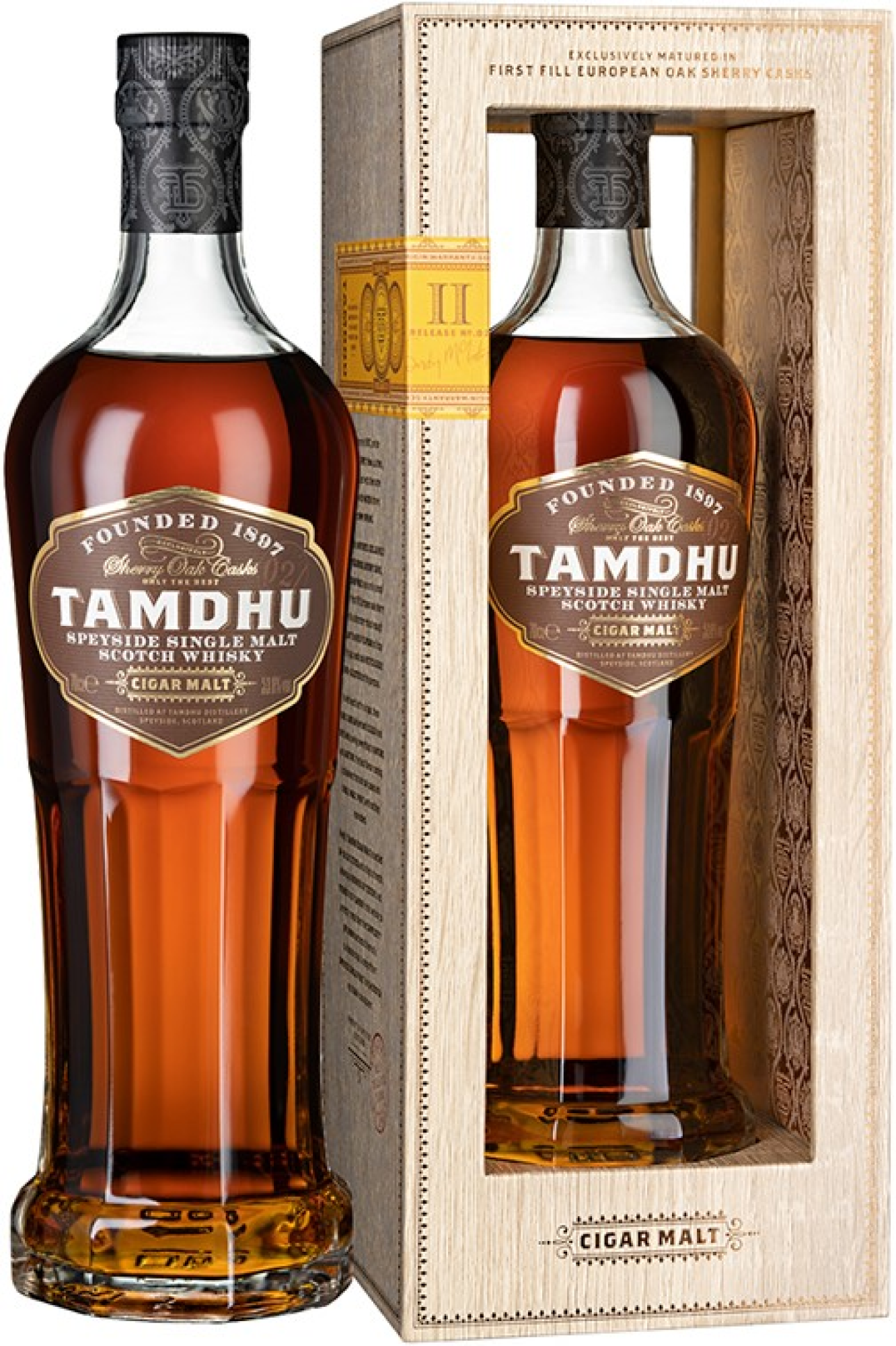 Tamdhu Cigar Malt III is de derde release in deze gelimiteerde serie van de Speyside distilleerderij en is ontwikkeld met het idee om voldoende body, textuur en diepgang te bieden naast een sigaar, maar ook op zichzelf volledig tot zijn recht te komen. Voor deze botteling gebruikt Tamdhu een kleine selectie first-fill European oak Oloroso sherry casks, zorgvuldig gekozen om een krachtig en rijk profiel op te bouwen. De whisky wordt gebotteld op 53,8% alcohol, met natuurlijke kleur en zonder chill-filtratie. Dat levert een stijl op met een volle structuur, uitgesproken sherry invloed en een mondgevoel dat breed en gelaagd blijft. In geur en smaak komen zoetere, kruidige en rijpere tonen samen, waardoor de whisky veel diepte krijgt zonder zijn balans te verliezen. Het is een expressie met aanwezigheid, warmte en lengte. Deze whisky wordt gebotteld op hoge sterkte en is niet koud gefilterd, waardoor hij een krachtige smaakopbouw en een fluweelachtige textuur behoudt. Tamdhu ontwikkelde deze uitgave specifiek met het oog op de geur en het mondgevoel van een met de hand gemaakte sigaar, zodat whisky en sigaar elkaar niet overheersen maar juist versterken.
