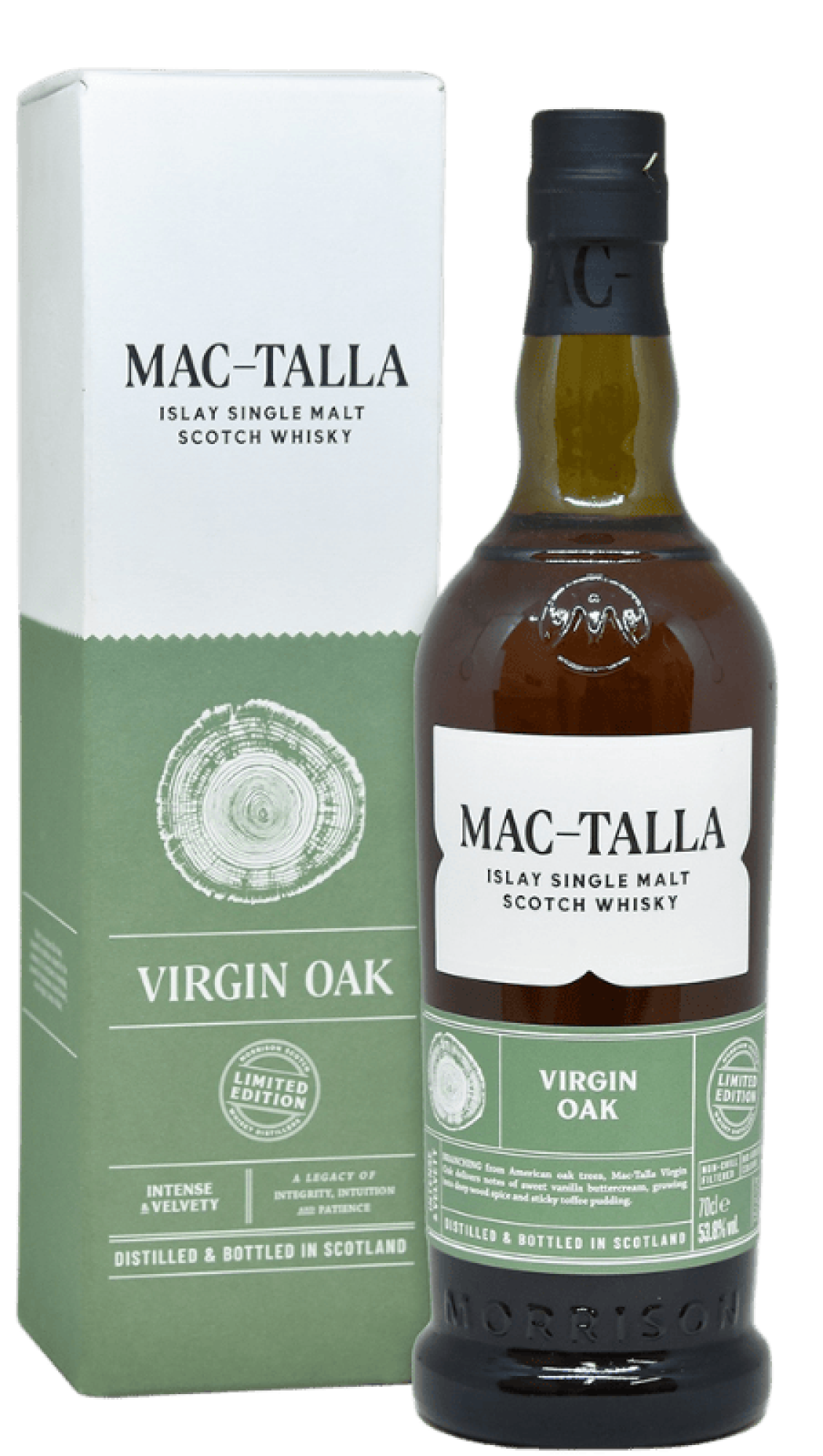Mac-Talla Virgin Oak is een gelimiteerde Islay single malt van Morrison Scotch Whisky Distillers die op 13 februari 2025 werd gelanceerd. Met deze release kiest Mac-Talla nadrukkelijk voor een andere invalshoek binnen het gamma: niet alleen turf en maritiem karakter, maar ook de uitgesproken invloed van virgin oak. Deze whisky is een no age statement release en de eerste Mac-Talla-expressie waarin virgin oak zo duidelijk centraal staat. De whisky rijpt volledig in een combinatie van bourbon barrels en #4 char virgin American oak casks van Kelvin Cooperage in Kentucky. Daarna volgt nog een extra finale periode in virgin oak barrels, waardoor de houtinvloed verder wordt verdiept en het smaakprofiel extra gelaagd wordt. Dat maakt deze botteling anders dan de meer klassieke Mac-Talla-stijl: de rook van Islay blijft duidelijk aanwezig, maar wordt hier verzacht en verrijkt door zoetere, warmere en meer gekaramelliseerde tonen. Wat virgin oak bijzonder maakt, is dat deze vaten nog nooit eerder voor een andere spirit zijn gebruikt. Het onbehandelde Amerikaanse eikenhout wordt zwaar verkoold, waardoor intense aroma’s ontstaan van karamel, toast, specerijen en vanilleachtige zoetheid. In deze whisky zorgt dat ervoor dat de rokerige Islay-stijl een opvallend zachtere en rijkere kant laat zien. Waar sommige geturfde whisky’s vooral op rook en ziltigheid leunen, brengt Mac-Talla Virgin Oak ook duidelijk tonen van dessertachtige zoetheid en geroosterd hout naar voren.