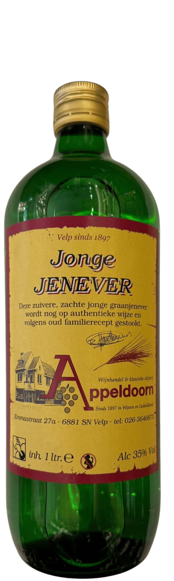 Deze Appeldoorn jonge jenever is samengesteld uit graanalcohol met een kleine hoeveelheid moutwijn om een lichte graantoon te behouden. De distillatie gebeurt in kolomstills voor een neutrale basis. De spirit wordt vervolgens opnieuw gedistilleerd met jeneverbessen en een traditionele kruidenmix die zorgt voor het aromatische profiel. Na distillatie rust de jenever enkele weken in roestvrij staal om de componenten te laten samenvloeien. De focus ligt op een helder karakter en een zachte structuur.